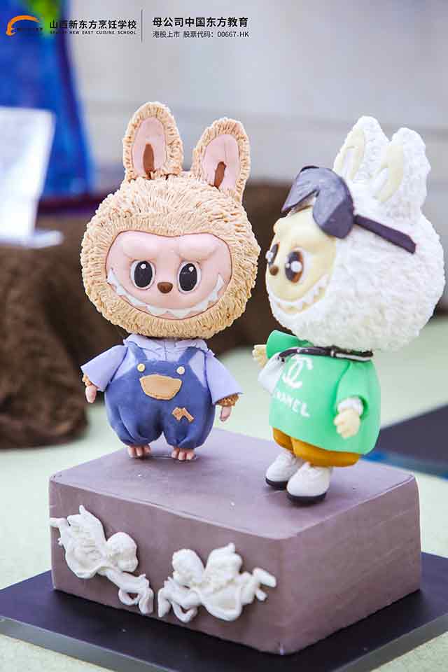 翻糖蛋糕區(qū)則把西點(diǎn)的“觀賞性”與“潮流感”拉滿,系列“拉布布”主題作品成為全場焦點(diǎn)。雪白糖膏塑出的圓潤耳朵、蓬松裙擺自帶萌態(tài),粉色糖霜勾勒的腮紅與蝴蝶結(jié)細(xì)膩傳神,連拉布布爪子上的絨毛紋理都清晰可見,靈動(dòng)得仿佛下一秒就要跳出展臺(tái)。這般巧思并非偶然,學(xué)校翻糖專項(xiàng)課程構(gòu)建了從基礎(chǔ)到高階的完整培養(yǎng)體系:從糖膏調(diào)制、基礎(chǔ)塑形的扎實(shí)訓(xùn)練,到角色設(shè)計(jì)、細(xì)節(jié)雕刻的進(jìn)階學(xué)習(xí),更緊跟市場趨勢引入IP聯(lián)名理念,讓學(xué)子的作品既具藝術(shù)質(zhì)感,又能精準(zhǔn)戳中當(dāng)下消費(fèi)者的審美偏好,自帶話題熱度。