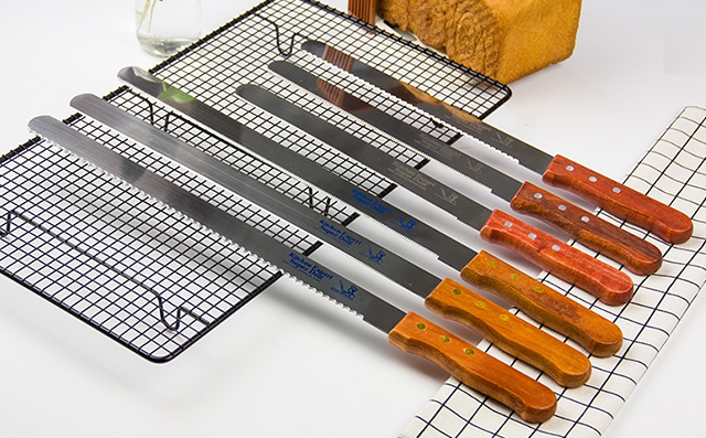 有些場合下蛋糕的質(zhì)地比較松散,或蛋糕的個頭很小,那么用普通的長鋸齒刀來切,可能還是會導(dǎo)致蛋糕不平整或者掉渣。這時候,可以選擇鋸齒更細(xì)的細(xì)鋸齒刀。