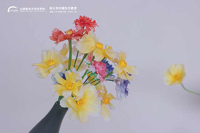 一件完美的翻糖花作品不僅要求同學(xué)們要懂食材配比與制作,要懂顏色調(diào)制,要懂花型花瓣、枝葉果實(shí)捏制,還要懂插花藝術(shù)?粗欢涠渖势G麗的糖花,陣陣糖香撲鼻而來(lái),如畫一般的造型,色彩的平衡,精美的飾品,充分體現(xiàn)了個(gè)性與藝術(shù)的完美結(jié)合,飽含著翻糖師傾注的心血,與想傳遞給他人的甜蜜夢(mèng)想。