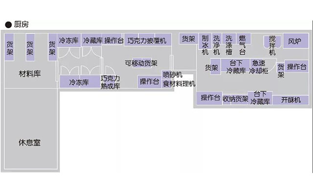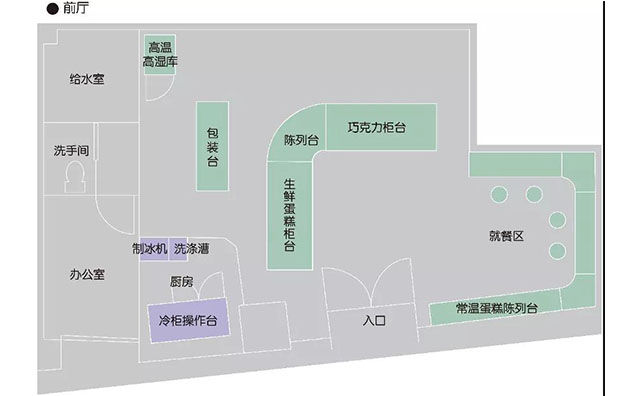 后區(qū)可細(xì)分為以下幾個(gè)功能區(qū):加工區(qū):烘焙現(xiàn)烤間、裱花操作間。休息區(qū):?jiǎn)T工休息和更衣的區(qū)域。倉(cāng)儲(chǔ)區(qū):儲(chǔ)存原料和成品的地方。清潔區(qū):儲(chǔ)存衛(wèi)生潔具和雜物。